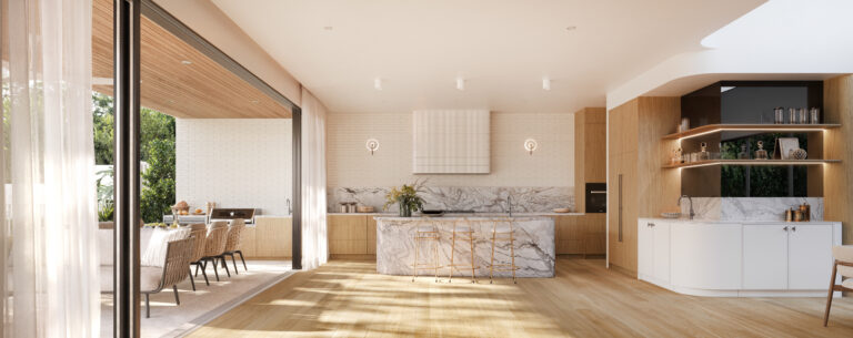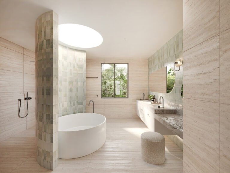 At the heart of the home lies an entertainer’s dream kitchen, anchored by a 5 metres long cooking bench and a sculptural island finished in Celest Dolomite stone. The indoor spaces echo the natural vitality of the outdoors, with a Linea brick wall creating a seamless connection between the kitchen and alfresco area.