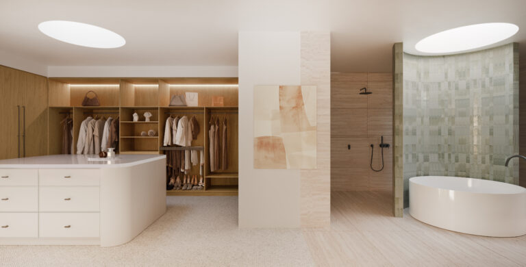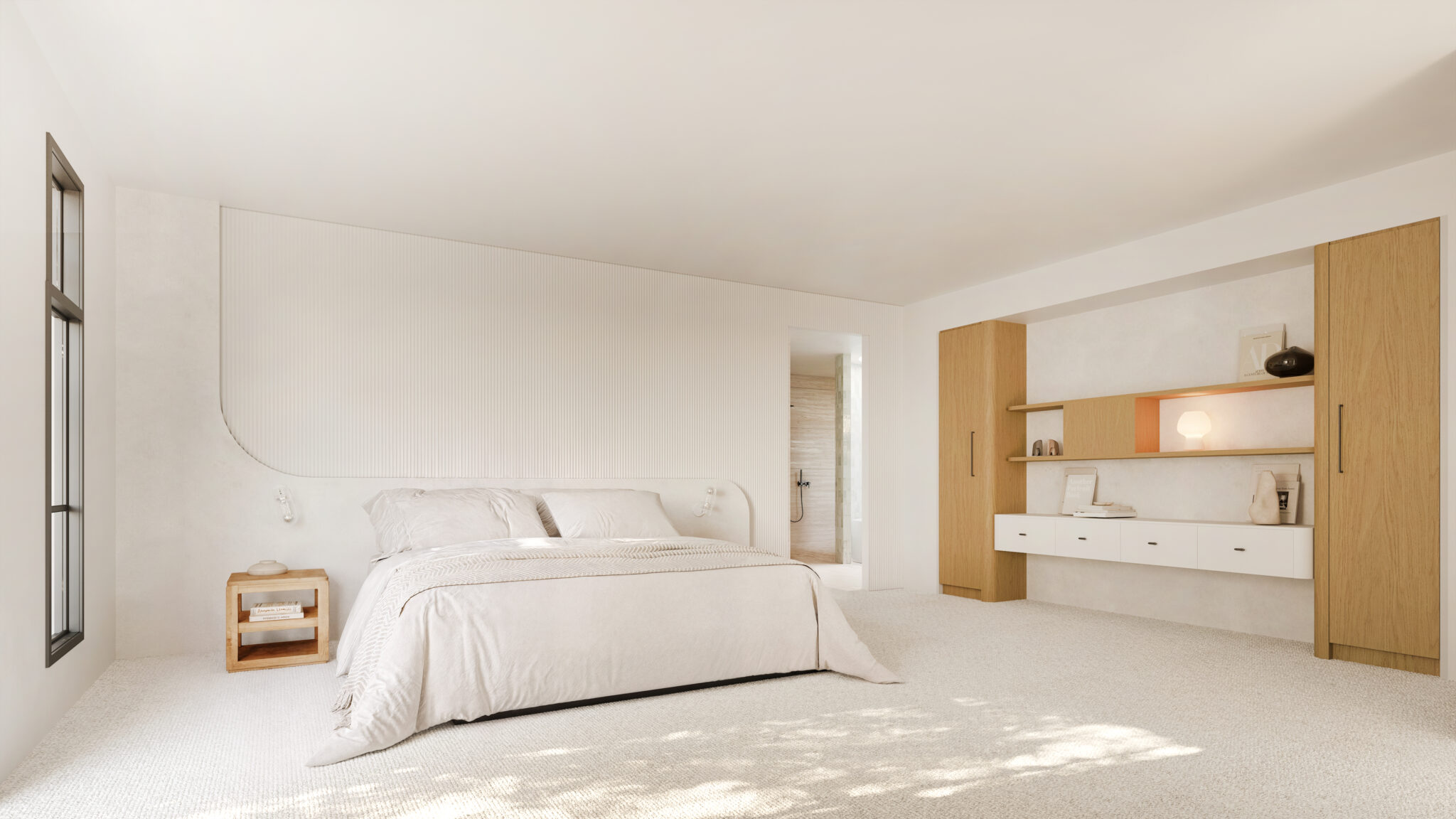Upstairs, the master suite is a private sanctuary of luxury. A built in library and display wall add warmth and personalisation, while the custom bedhead wall features a concealed door that opens into a walk in robe and opulent ensuite. The ensuite showcases large-format travertine-look tiles (1200x600mm), a curved feature wall and a round freestanding bathtub positioned beneath a skylight for a spa like experience.