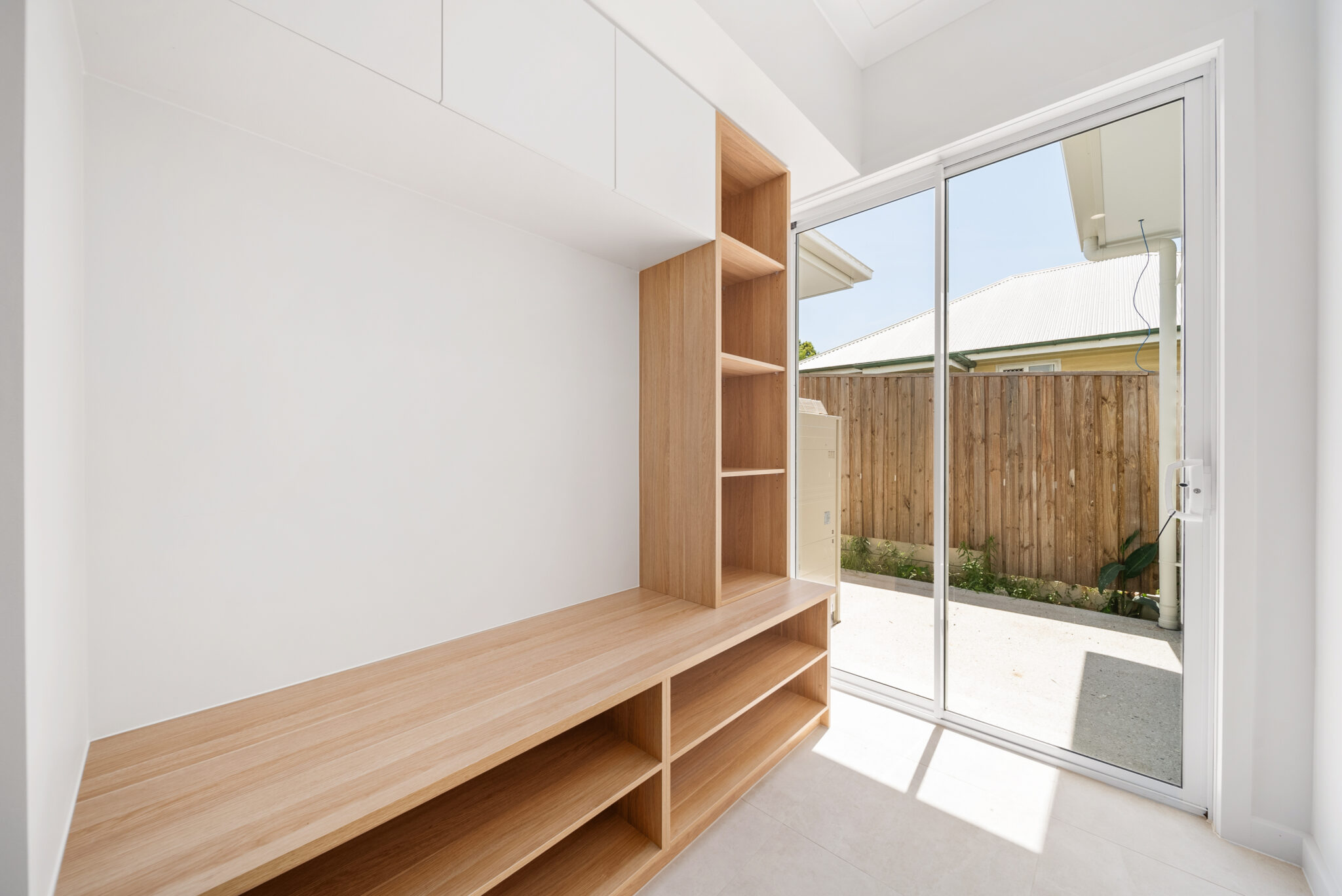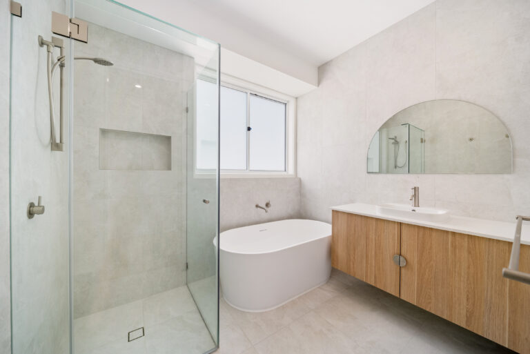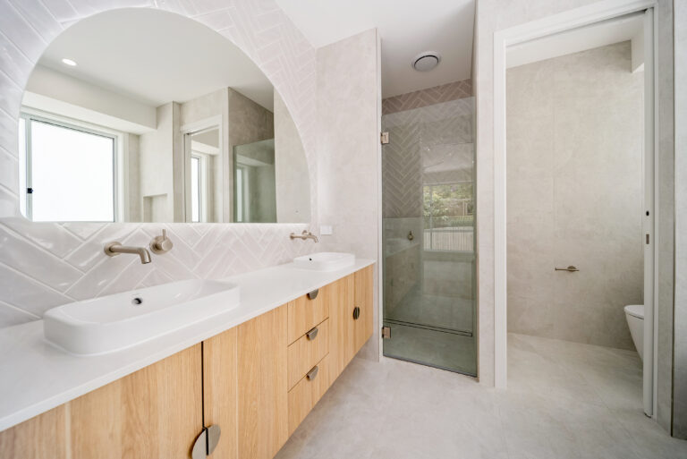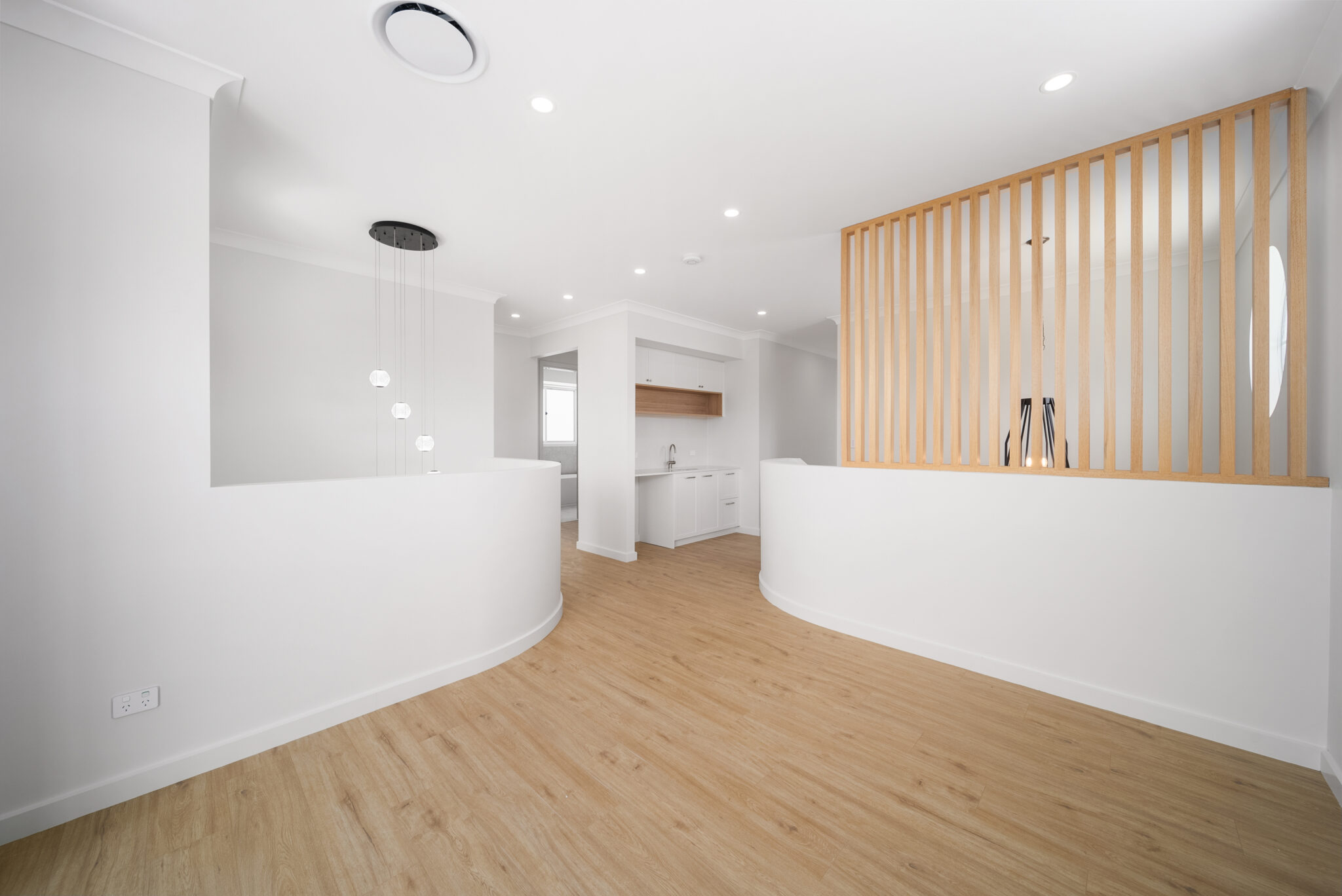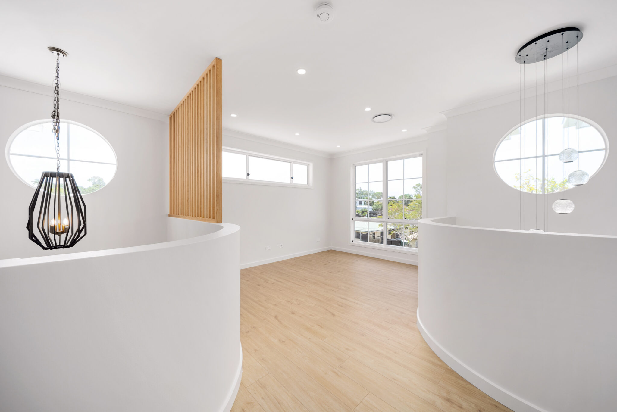 The Oak staircase anchors the interior with dowel handrails, and tread lighting, framed by a batten screen and feature pendant. Upstairs, private retreats are softened by Natural Oak flooring and wool carpet, with the master suite offering a freestanding bath, dual vanities, and a recessed LED mirror surrounded by herringbone tiling.