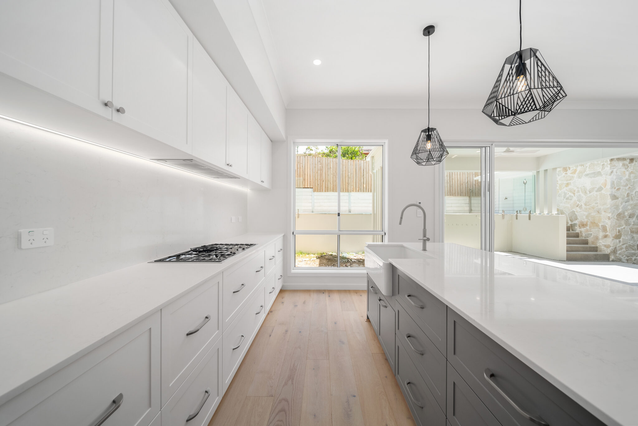 Inside, the home is defined by engineered timber flooring, brushed nickel fixtures, and muted cabinetry. Within the kitchen benchtops meet Hampton-profile cabinetry, recessed LED strip lighting, and a farmhouse fireclay sink beneath pendant lighting in matte black. A butler’s pantry, wet bar and separate kitchenette extend the culinary experience.