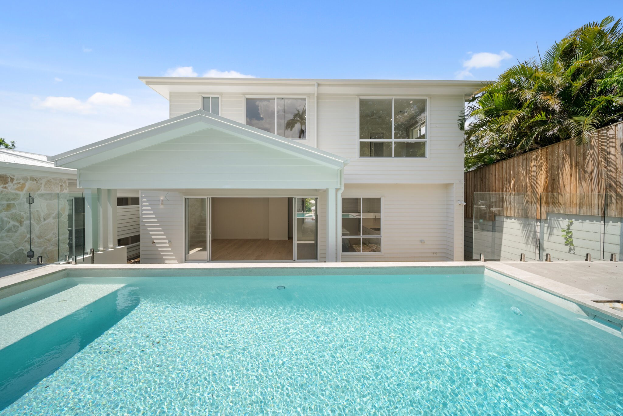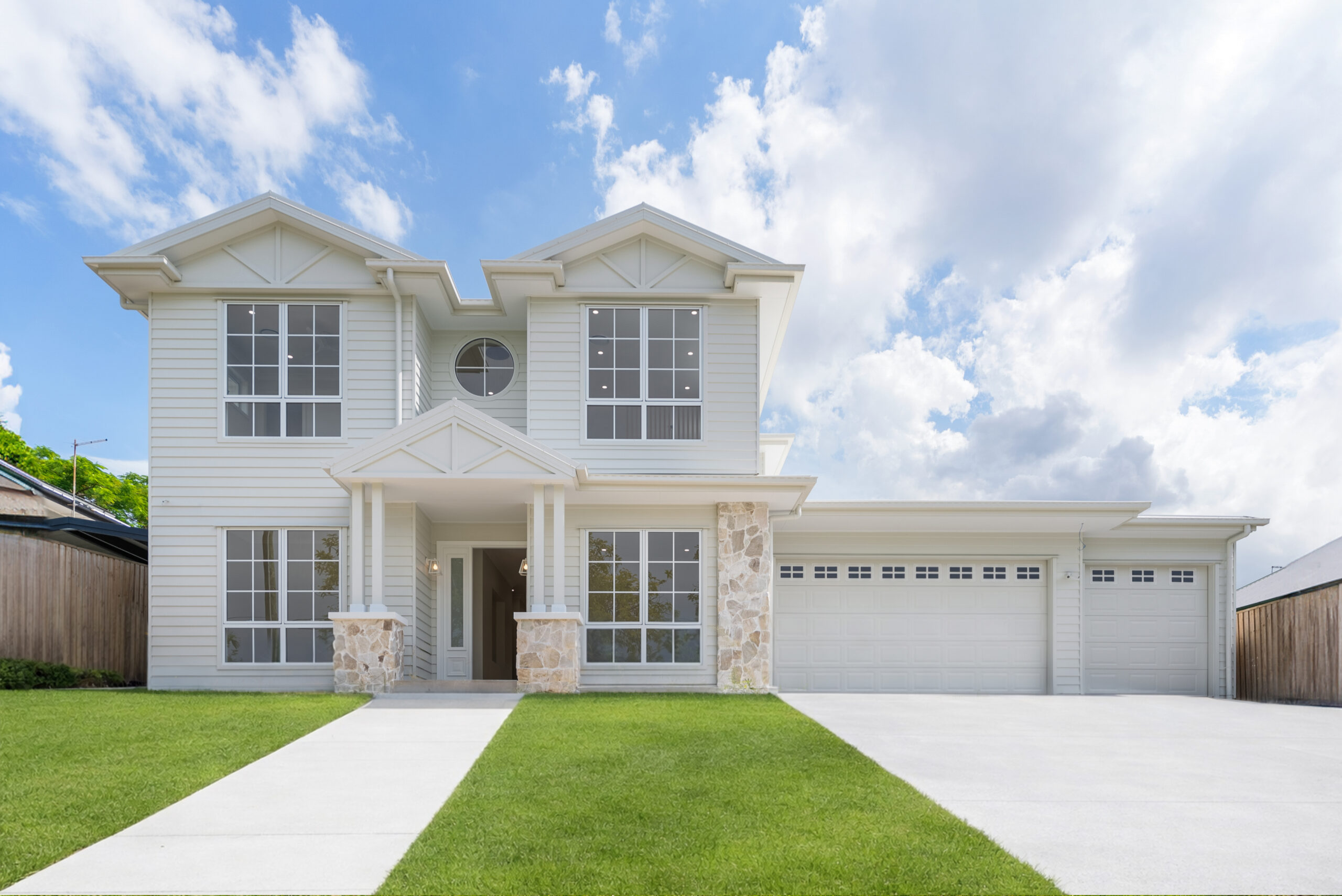 Poised on a generous 607m² site, Solenne is a residence of refined rhythm and coastal clarity, thoughtfully designed for intergenerational living at its finest. The Hamptons-inspired façade pairs horizontal cladding with stacked stone columns, white detailing, and a pivot entry door framed by a translucent sidelight. Painted posts add verticality, while a central circular window and layered lighting complete the street-facing composition with grace.