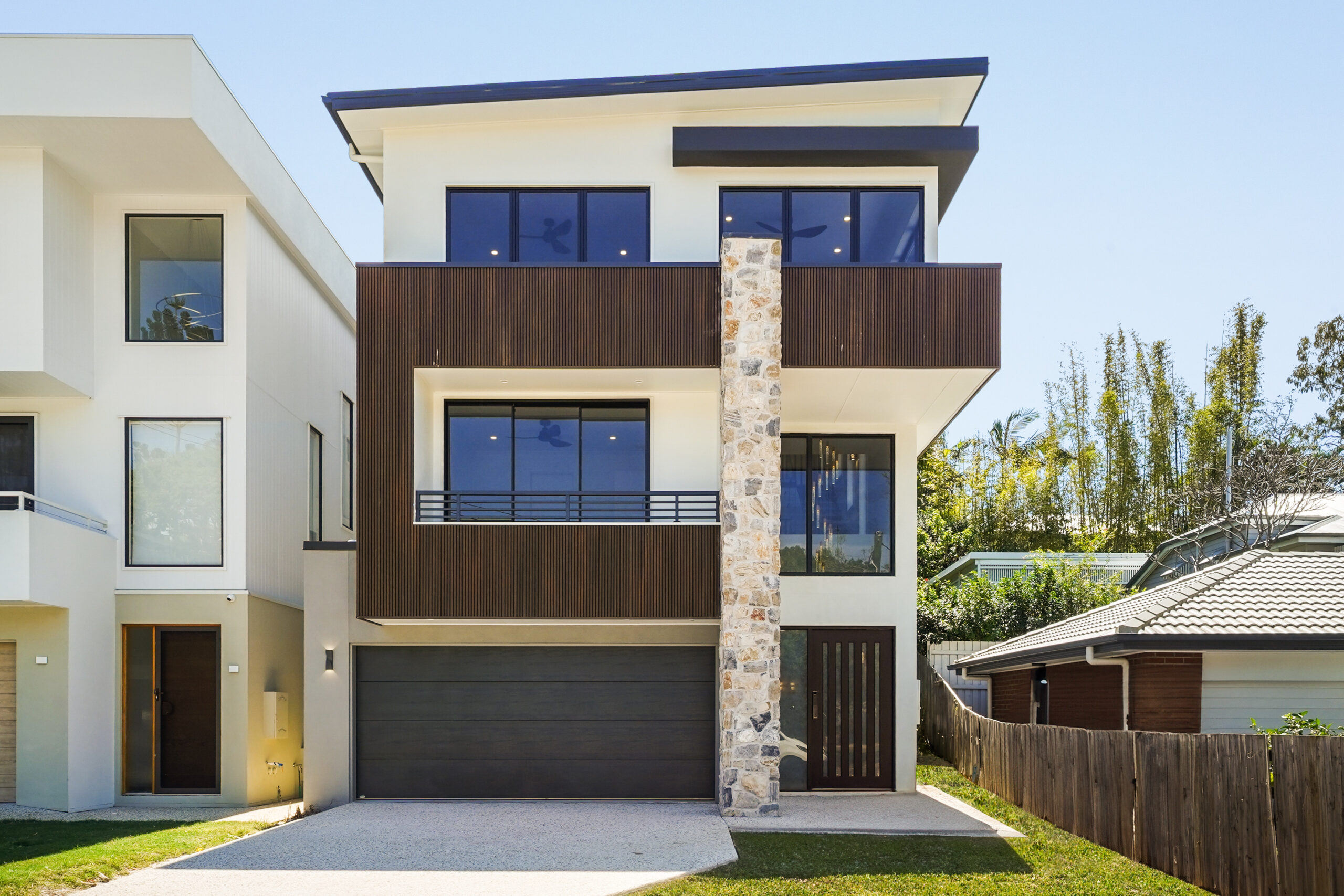 Poised across three sculptural levels on a sloped site, Altura is a residence of vertical elegance and refined materiality. Its modern façade pairs soft white render with loose stone, timber batten screening, and deep accents creating a layered composition. A recessed entry and oversized glazing introduce rhythm and transparency.
