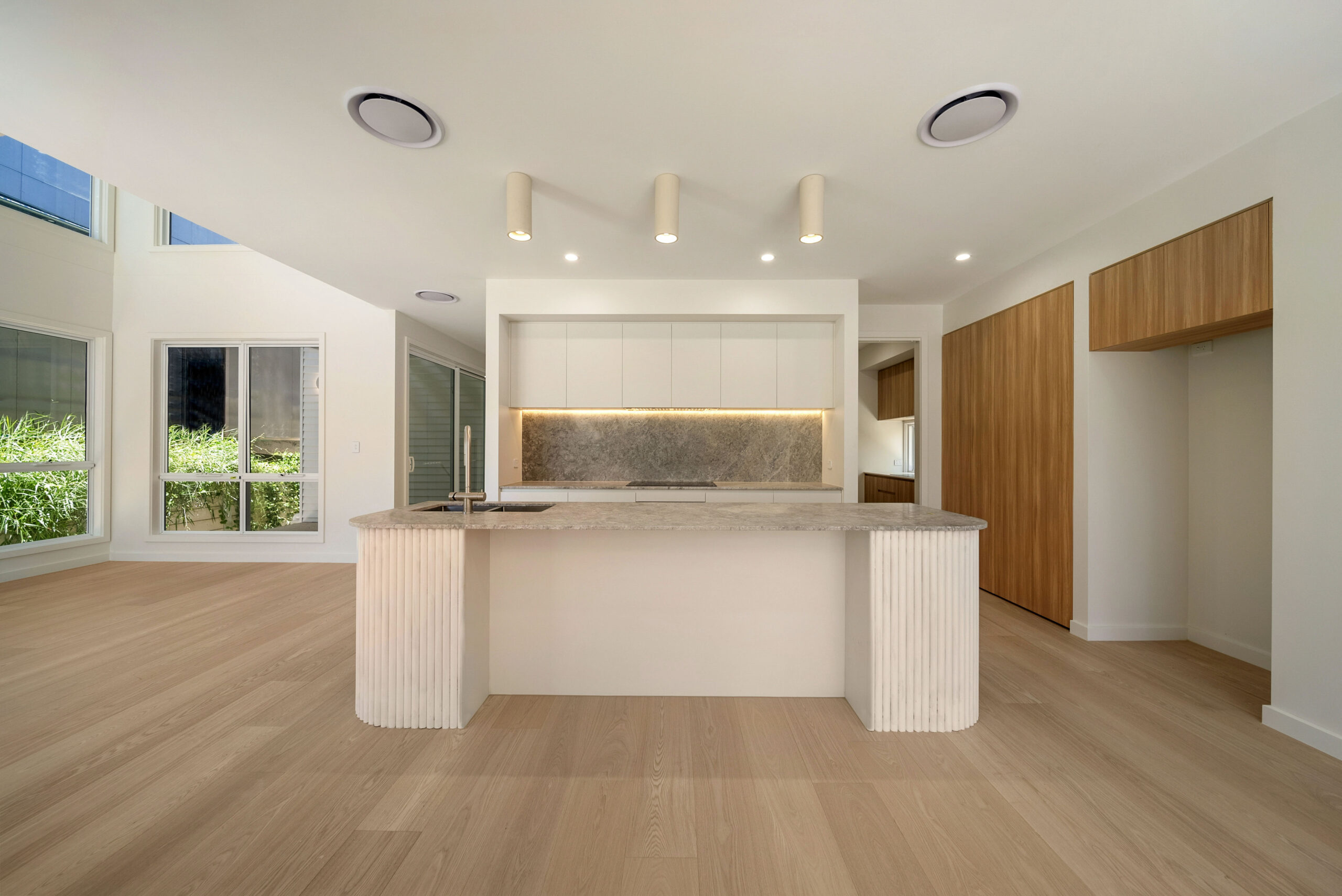 Inside, the spatial rhythm flows across timber flooring, with recessed strip lighting and refined feature walls drawing focus to tailored finishes. The kitchen and living areas highlight fluted cabinetry, stone waterfall edges, and pocket doors, softened by warm timber accents and brushed nickel hardware.