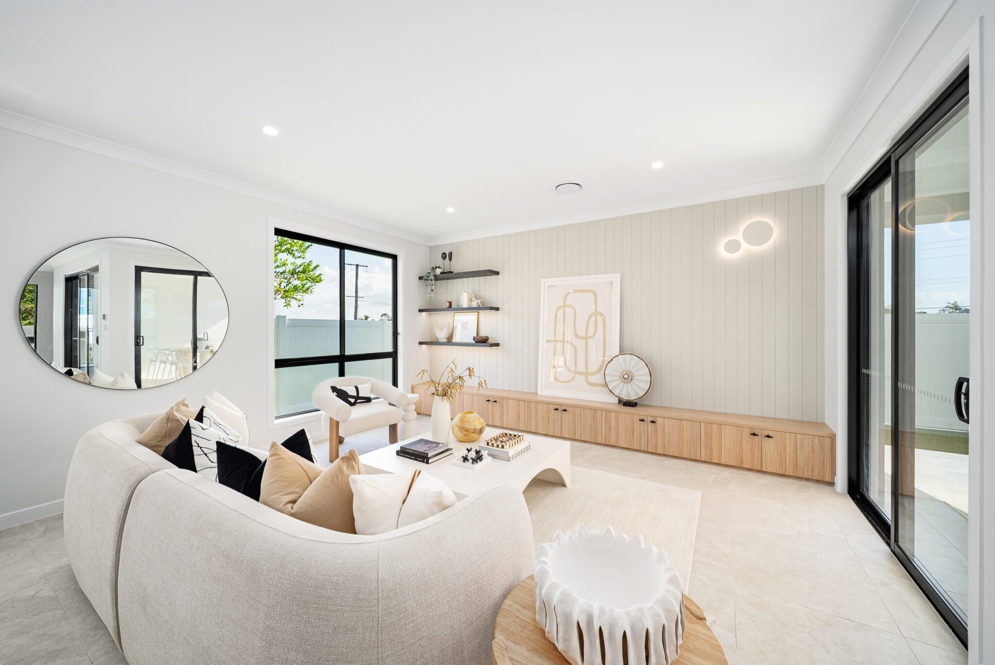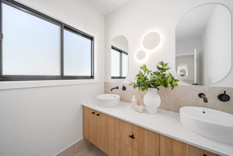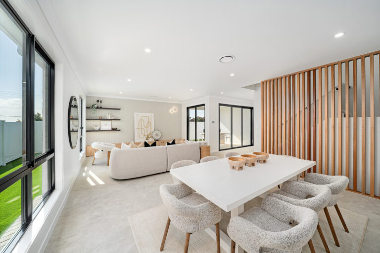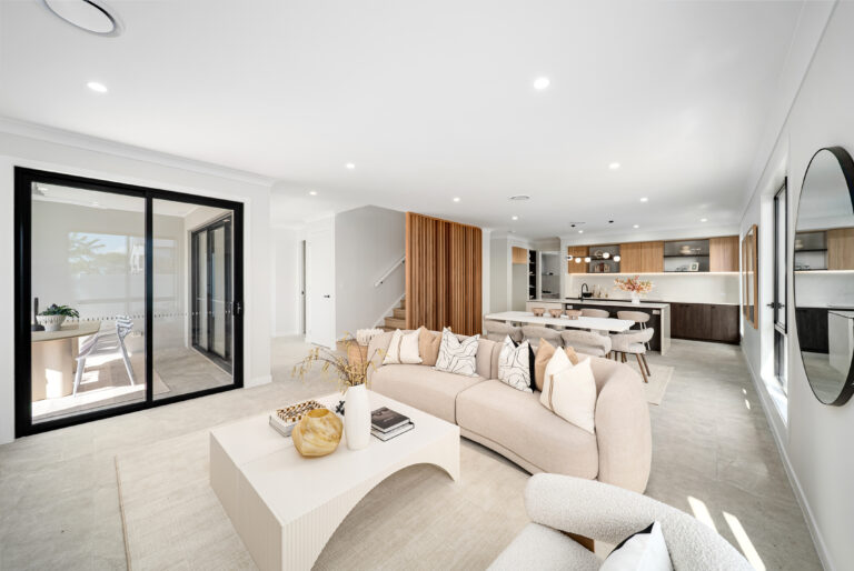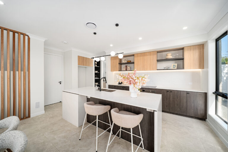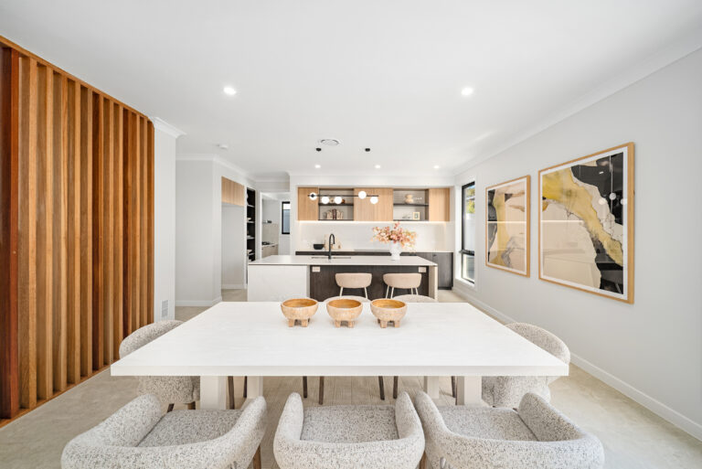 The generous open-plan layout seamlessly connects the living, dining, and kitchen areas, offering an effortless indoor flow. Premium finishes include a striking contrast colour scheme using Polytec Natural Oak and Perugian Walnut cabinetry, complemented by resort-inspired Tundra stone-look tiles for a modern, refined aesthetic.