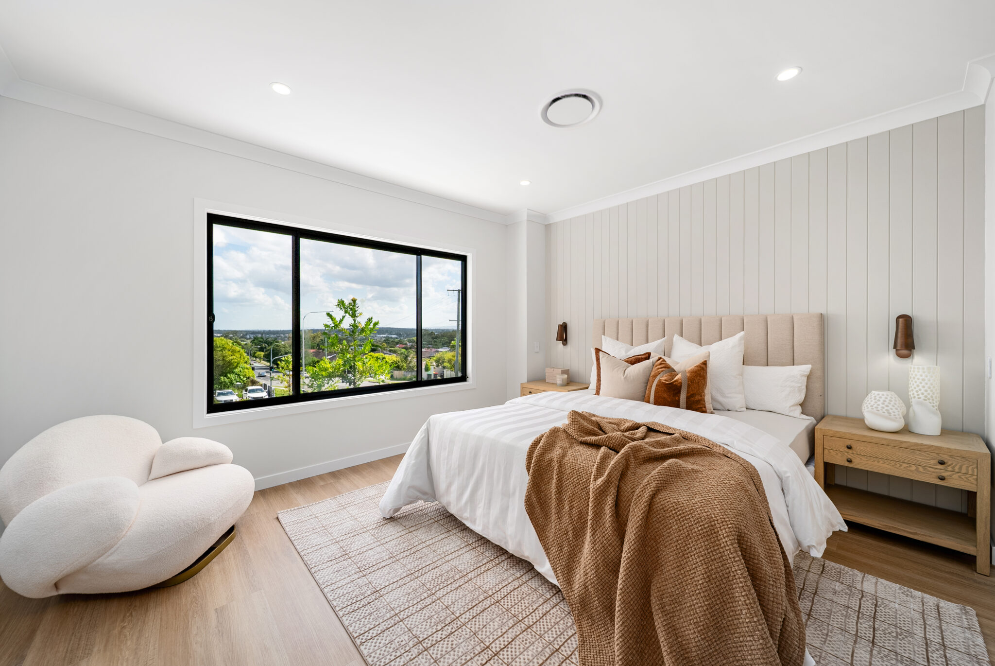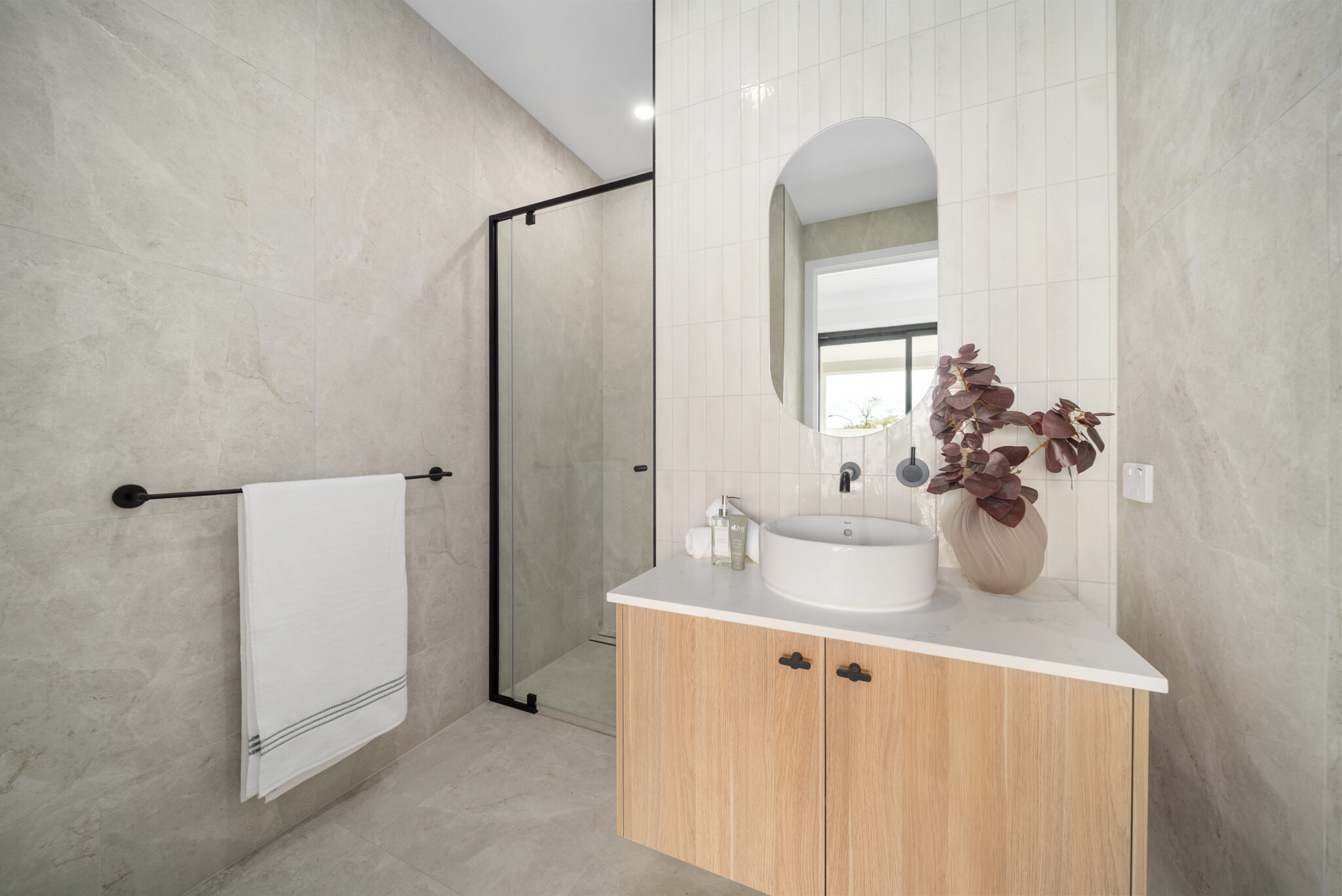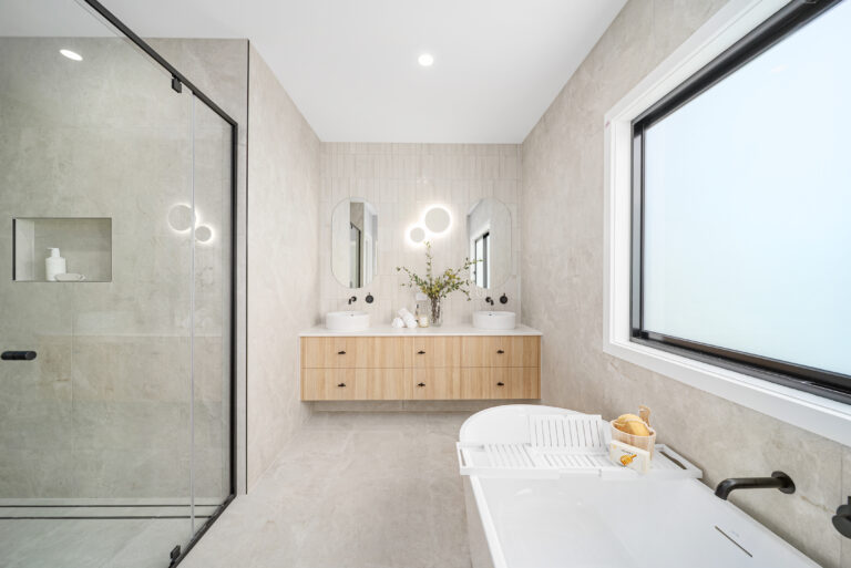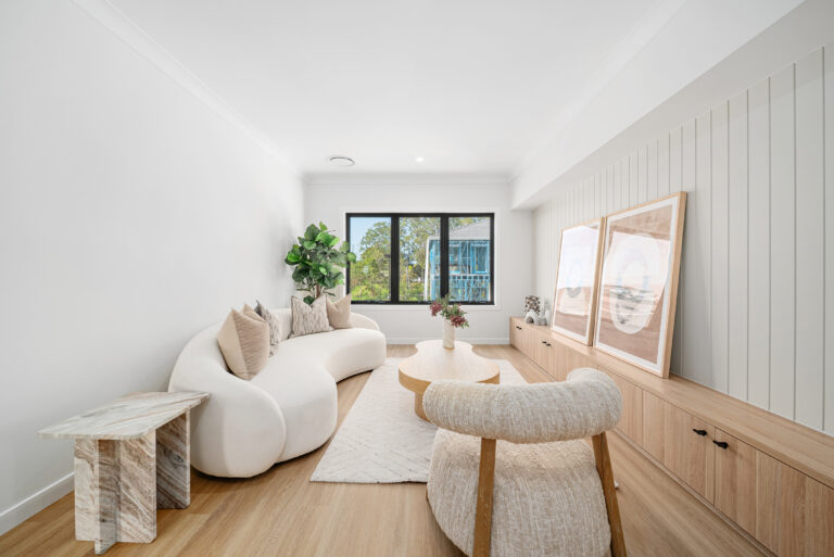 The generous open-plan layout seamlessly connects the living, dining, and kitchen areas, offering an effortless indoor flow. Premium finishes include a striking contrast colour scheme using Polytec Natural Oak and Perugian Walnut cabinetry, complemented by resort-inspired Tundra stone-look tiles for a modern, refined aesthetic.